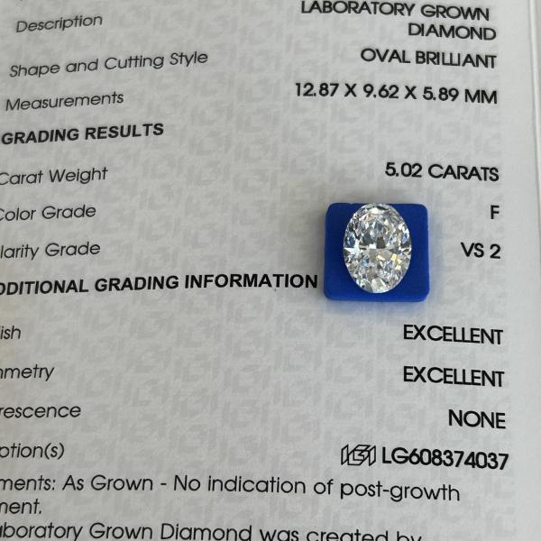 5.02ct Lab Growm Diamond Oval Cut CVD F VS2 2EX N IGI | LG608374037